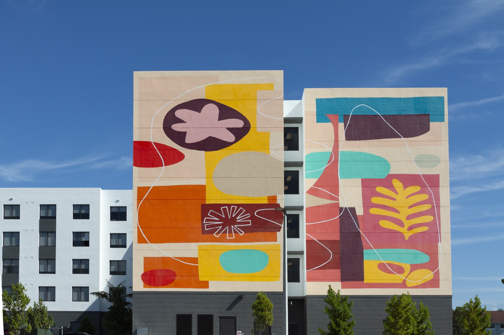 WXLLSPACE was engaged to manage the full commissioning process. The developer had already selected Alain Castoriano as the original artist. WXLLSPACE sourced Abstrk, a professional mural artist from the WXLLSPACE network, to execute the fabrication on-site. The result is a 2,465 SQFT abstract mural on a 43-foot stucco facade, completed in 22 days and finished with a UV-protective clear coat rated for South Florida exterior conditions.