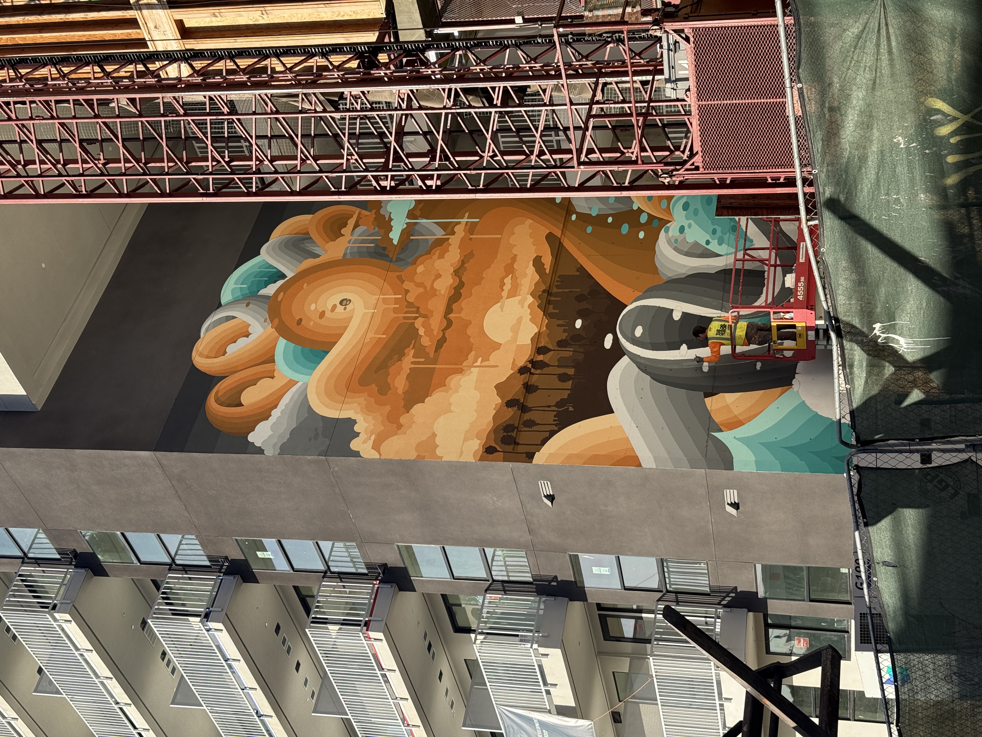 - Equipment mismatch: the lift provided on day one was undersized by approximately 10 feet. The WXLLSPACE team remeasured the wall remotely and secured a larger lift the following day, requiring a proportional design adjustment to maintain visual integrity at scale.